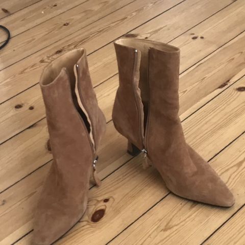 Ruskind og læder. Kraftig sål. Lynlås foran. Nypris 1800. Næsten ikke brugt, da de er for smalle til mi e fødder