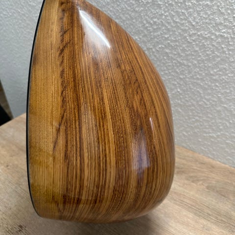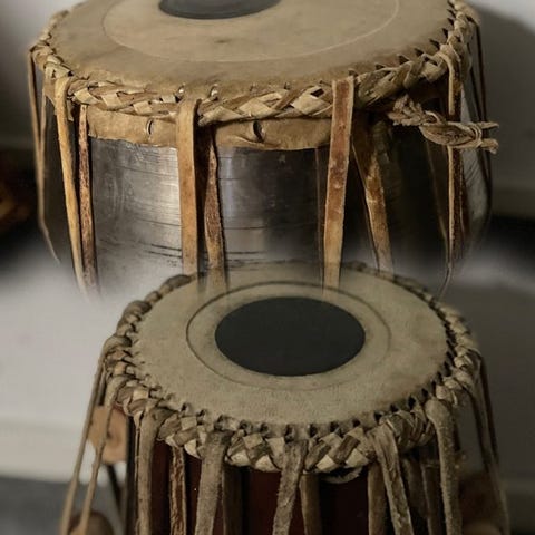 Denne klassiske indiske tabla er smukt håndlavet med en mørklakeret træramme og spændt med læderremme. Instrumentet fremstår i god stand og bærer præg af traditionelt håndværk.