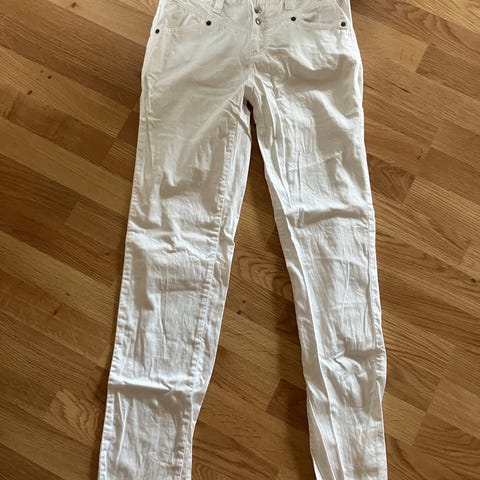 Flotte hvide bukser med lille mønster nederst på benet 76cm lang af 62%bomuld 34% polyester & 4% elastan