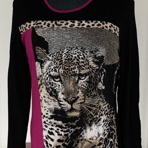 Blazer fra Frank Walder i sort farve med brunligt mønster uden for. I størrelse 42 med et brystmål på cirka 108 cm og en længde på cirka 63 cm. Blazeren er fremstillet af 68% polyester og 32% viskose. Blusen medfølger ikke.