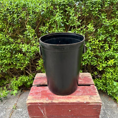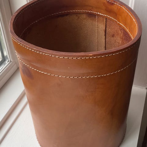 Papirkurv i rødt farvet kernelæder med 2 messinghanke.