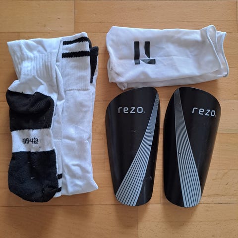 Select beskyttelsesudstyr til fodbold i blå og sort farve. Udstyret er designet til at beskytte under spil og træning og har justerbare stropper for en sikker pasform. Materialet er holdbart og egnet til sportsbrug.
