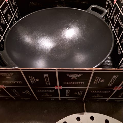 Støbejern. Velegnet på alle varmekilder incl induktion, men også på grillen og ved bordet. 34 cm i diameter