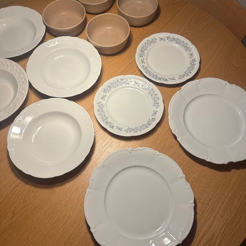 Flere forskellige skåle til salt, smør, nødder mm, små krukker, flødekande. Flere aftvinger er ildfaste.