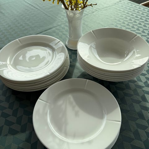 Har 9 stk. pizza tallerkener eller store spisetallerkener, der måler 30 cm i diameter. De kan evt. også bruges som fade. Ingen skår eller mørke streger efter brug, da de kun har været brugt 2 gange. Farve: Elfenben. Vejl. udsalgspris 269 kr. pr. stk. Sælges, fordi vi også har spisetallerkener med en diameter på 27 cm, og dem bruger vi mest.