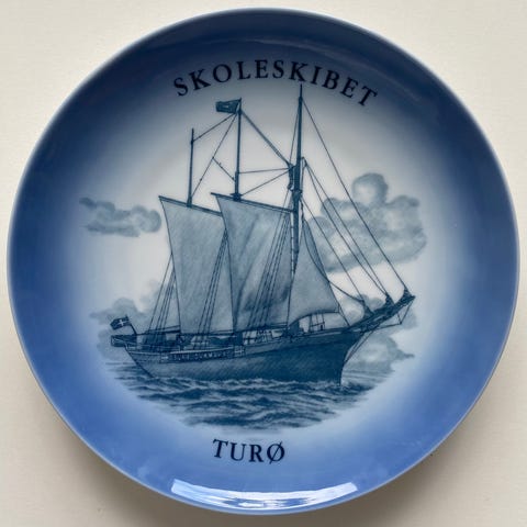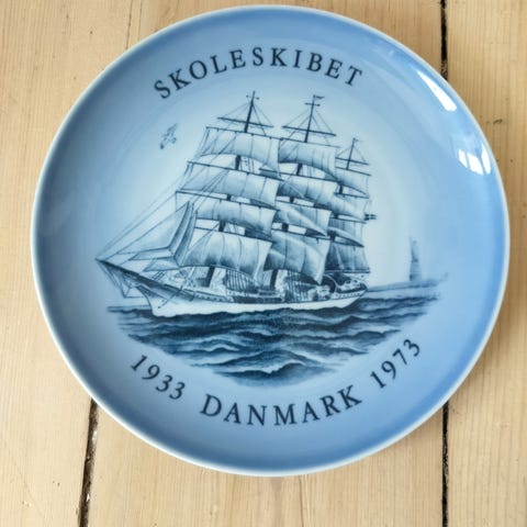 Skoleskibet Viking platte med motiv af skoleskibet fra perioden 1906 til 1975. Pladen har en blå og hvid farve og viser et detaljeret billede af et sejlskib med flere master. Pladen er velegnet til samling eller som vægdekoration.