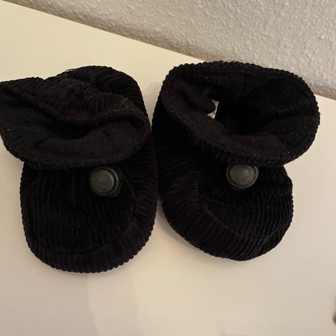 Melton dreng børnesko i størrelse 18. Skoene er sorte og lavet af kunstlæder med en velcrolukning for nem justering. Sålene er bløde og velegnede til små børns fødder.