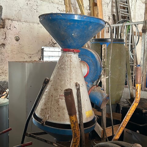 Blæseren blæser luft igennem kornet når det falder ned igennem den og får seperatoren indeni til at dreje rundt . Det er en cyclon-seperator. (400 Volt - 3 faser)