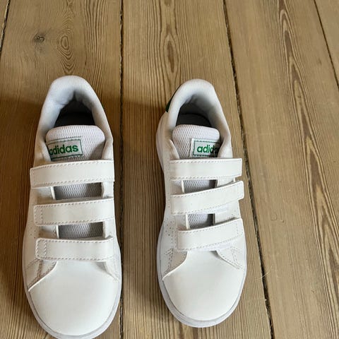 Adidas Stan Smith CF C børnesko i størrelse 35. Skoene er hvide med røde detaljer og har tre velcrolukninger. Designet er til piger og skoene er lavet i materialer, der sikrer komfort og holdbarhed.