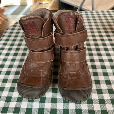Bisgaard børnestøvler til dreng i størrelse 30. Støvlerne er brune og lavet af læder med en varm, uldlignende inderside. De har en gummisål med mønster for bedre greb og to velcrolukninger foran for justerbar pasform.