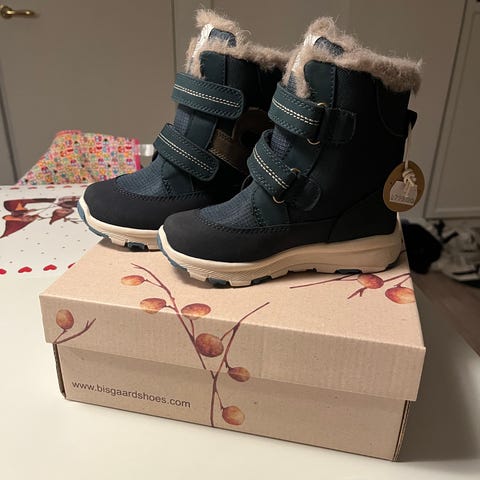 Bisgaard, unisex, Dejlig varme vinterstøvler med uldfor i støvlen og med velcrolukning. Er købt i efteråret 2024. Trænger lige til at blive pudset, ellers i pæn stand uden huller og skrammer.