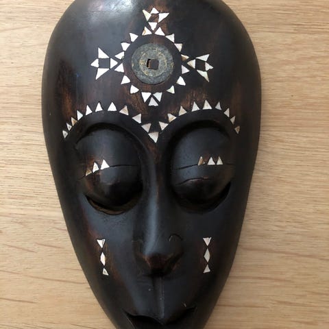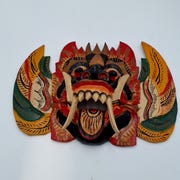 Sælger en autentisk, håndlavet Barong maske fra Bali. Masken er udskåret i let træ og omhyggeligt håndmalet i klare farver som rød, sort, gul og hvid. Barong er en god ånd i balinesisk mytologi og symboliserer beskyttelse og det gode.