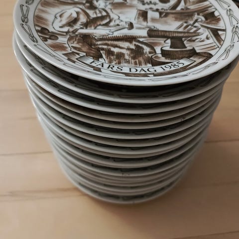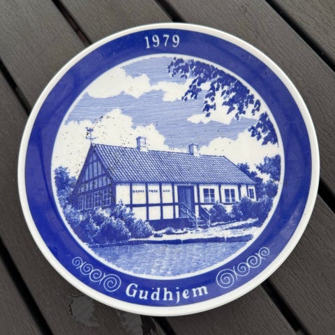 Fin gråblå platte fra Gustafsberg fra 1975, som fejrer fabrikkens 150 års jubilæum som producent af procelæn til mange forskellige formål.