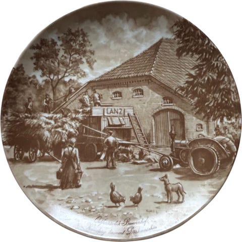 Fadet / Platten viser i midsten en mejetærsker medens der rundt i kanten viser et antal forskellige motiver, der alle har noget med høsten at gøre.