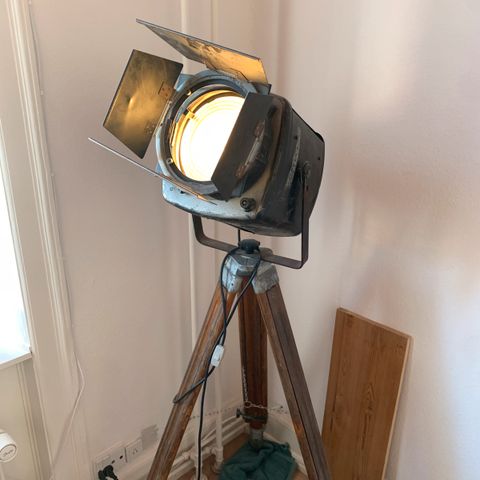 Jeg bruger ikke fiks og færdig, men sender gerne med dao eller GLS. Sjov stander- film- projektørlampe. Kan sættes i forskellige højder, selve lampen (hoved) kan sættes i forskellige retninger. Giver godt lys. Skal muligvis ha’ skiftet ledning. Mega tung så sender helst ikke. 700 kr. Kan afhentes i Farum.