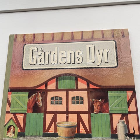 Pegebog. Sammen med en kort tekst vises fotos af otte forskellige dyr: grise, køer, høns, kaniner, katte, heste, får og geder.