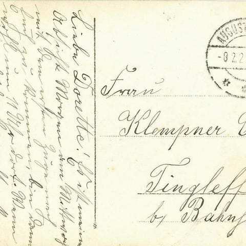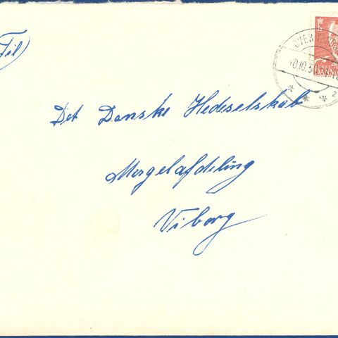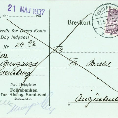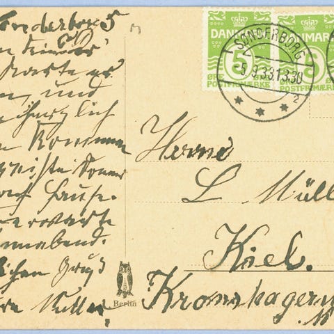 Flot kuvert fra Sønderborg til Majbøl pr. Hørup. Poststemplet (Bro IIb-1) Sønderborg d. 17.12.1921. Frankeret med 20 øre blå: Sønderborg Slot. Selve kuverten har fået klippet toppen væk.