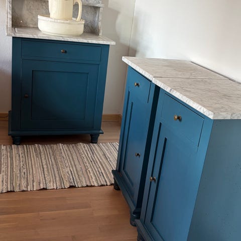 Antik hvidt natbord med marmorbordplade og skuffe
