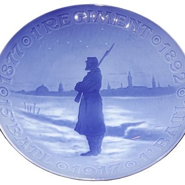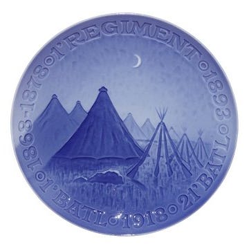 Teskten på denne platte siger: "1. regiment - 1878 - 1' Batl - 1917 - 21' Batl - 1893" - og motivet er en danske militær teltkejer, hvor geværene står klar udenfor teltene.