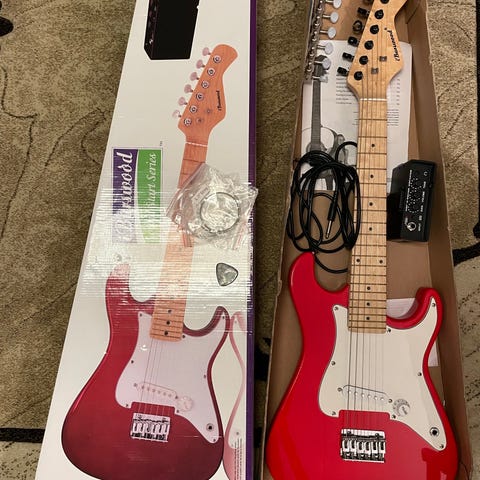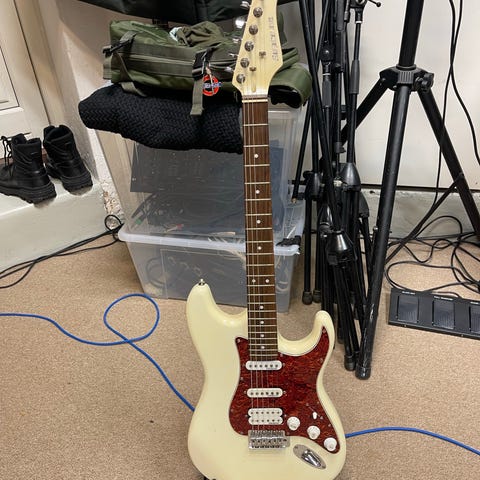 Velholdt Supreme Stratocaster m ahorn hals og rosewood gribebrædt, 2 single coil og humbucker pick ups. 5 pols omskifter. Kommer med få alm brugsspor. Virkelig fin starter guitar. Rap lille Fender forstærker sælges også, så har du et godt sæt. hey, du får lige en pose med til guitaren.