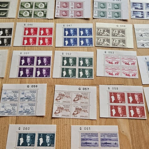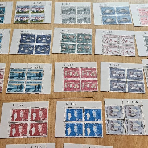 22 stk. Grønland frimærkesamling fireblokke/marginalblokke. Nummerering fra G 014, G 015, G 017, G 018, G 020 samt G 023 til G 039 Postfriske.