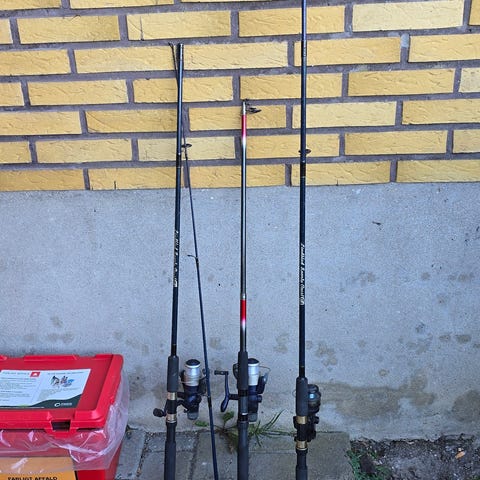 6 brugte fiskestænger med hjul,får ikke dem brugt,brugt nogle gange,200kr stk eller samlet 1000kr