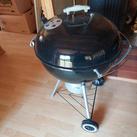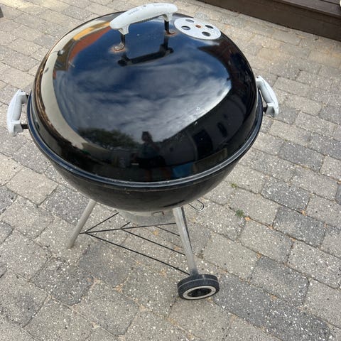 Weber kuglegrill i sort stål med låg og ventilationsåbninger. Grillen er udendørs og velegnet til kulgrillning. Den har et rundt design med håndtag på låget og en underkurv til opbevaring af kul eller tilbehør.stor grill 150kr ,lille grill 50kr