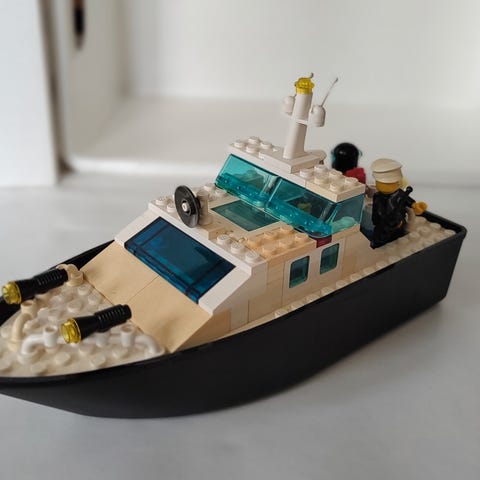 LEGO City Politibåd legetøjssæt med forskellige byggeklodser i farverne sort, hvid og rød. Sættet inkluderer dele til at bygge en politibåd med detaljer som flag og cockpit. Passer til børn og samlere, der ønsker at bygge og lege med en politibåd fra LEGO City-serien.