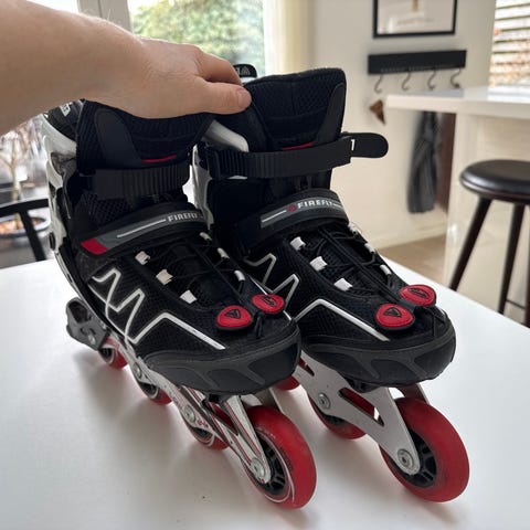 Herre rulleskøjter str 44.nypris 900 kr.Firefly.essence series.elghtyfour.20 millimeter.Hardness 80a.Har kun været prøvet på,og så bare stået .skal lige have en klud.