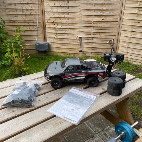 Bilen har været ude at køre tre opladnings batter medfølger med lidt plastik dele Men desværre kan jeg ikke finde bruges forvirring på den . medfølger med et batteri men uden lader