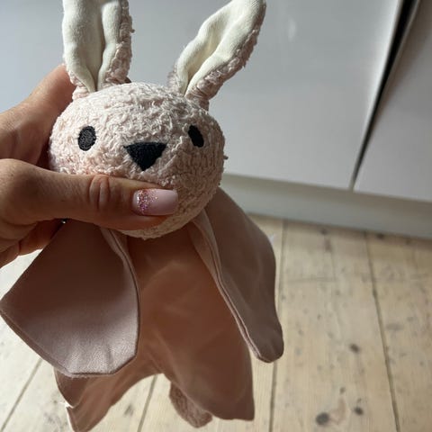 Sutteklud nusseklud Bamse legetøj lavet af blødt stof i en brunlig farve med et dyrehoved. Legetøjet er designet til børn og kan bruges som en trøstende bamse eller krammedyr.
