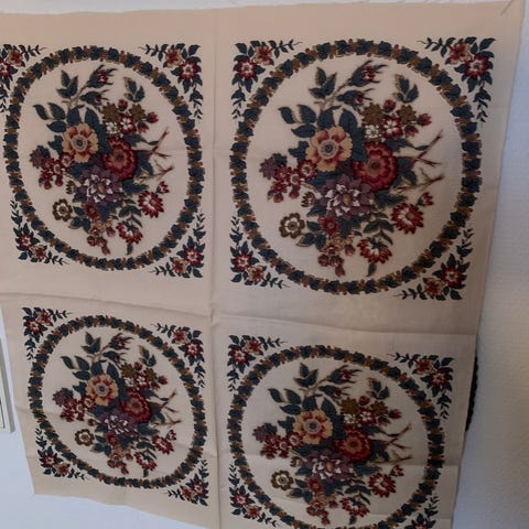Fire nuancer af samme mønster. Alle ”går” sammen i farverne. Hvert stykke måler 65 x 67cm. Fantastisk flot mønster. Velegnet til f.eks. dækkeservietter eller puder. Vejer 450g.