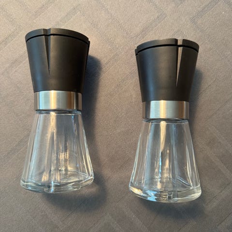 Krydderikværne, Rosendahl, 3 store krydderikværne med låg fra Rosendahl i glas, hård plast og rustfrit stål. Supergode og dekorative. 20 cm høje og vejer 1,2 kg tilsammen. nypris er 600 kr. Sælges til fast samlet pris + evt DAO fragt.