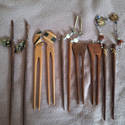 Til det opsatte hår: To flotte hårpinde til at fæstne håret. De er 18 cm lange. 25 kr. stykket.