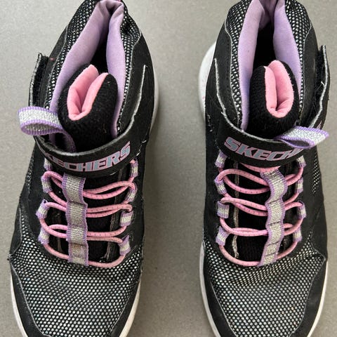 Skechers børnesko til pige i størrelse 33. Skoene har forskellige designs og materialer, velegnede til daglig brug og forskellige vejrforhold.