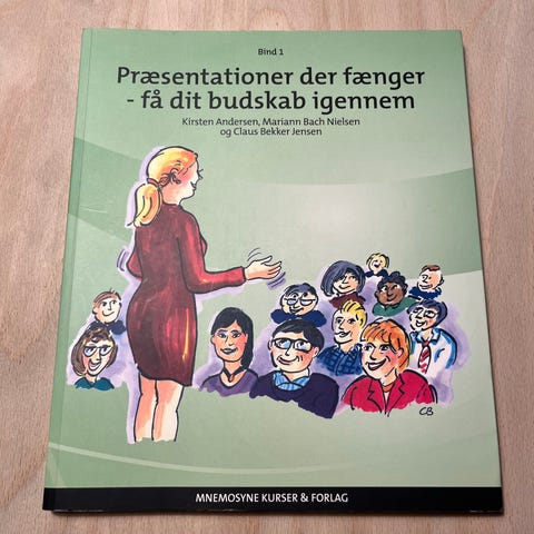 Mnemotrix Kursus & Forlag Bind 1 Præsentationer der fanger - få dit budskab igennem bog. Bogen er på dansk og indeholder metoder og teknikker til at forbedre præsentationsevner, illustreret med tegninger og eksempler. Den er velegnet til undervisning og personlig udvikling inden for kommunikation.