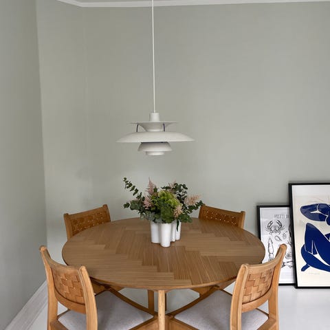 Vi sælger vores Ø110 Sildebensbord i hvidolieret EG. Den er specielt lavet til os. Den er 1 år gammel, og sælges grundet det ikke passer ind i det nye hjem.