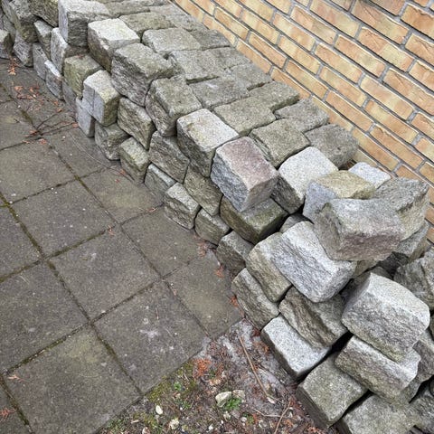 Pakker med byggematerialer bestående av granitt og betongstein i ulike størrelser og former. Materialene er egnet for bruk i uteområder som hage, gangveier eller støttemurer. Steinene er stablet og klare for transport eller videre bruk.