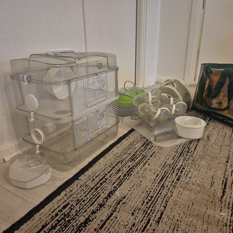 Hamterbur på hjul med inderkasse i plast. Mål bredde 83 cm, dybde 41, højde 63 cm. Drikkedunk medfølger.