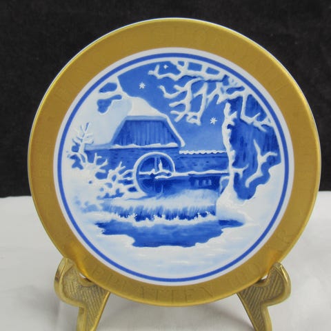 Flot hvid platte fra Bing & Grøndahl i blå stregtegning med guldkant.