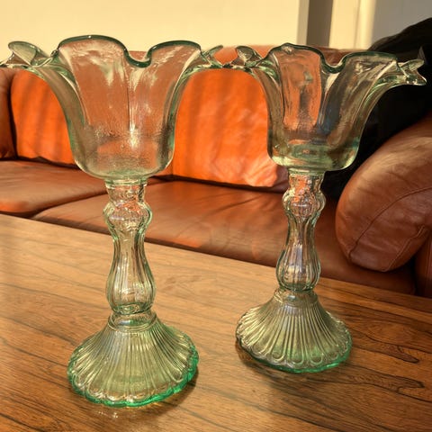 Jeg sælger disse to lysestager i grøn glas. Fremstår som nye.
