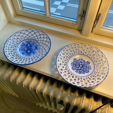 Willer skål i keramik med blå og sort glasur. Skålen har en rund form med dekorative blå prikker og en fodet base. Egnet til brug som dekorativt element eller til servering. Kan sendes.
