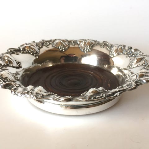 Engelsk vinbakke / wine coaster af Sheffield sølv plet, bort med vinranker / vindruer og bladværk, bund af lakeret træ. Første halvdel / midten 1900 tallet. Diam. 19 cm.