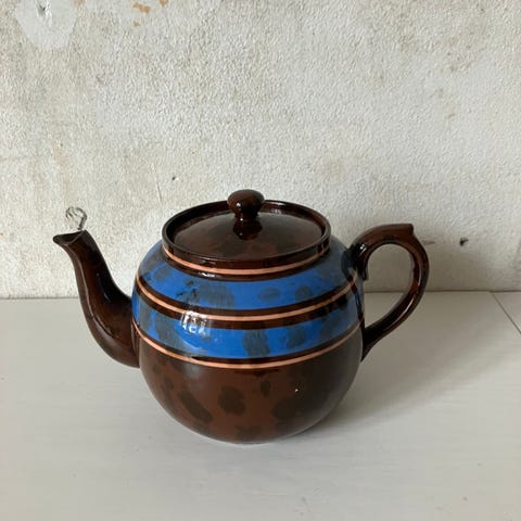 Gammel keramisk tekande i brun glasur med gule blade. Lavet i England. I god stand foruden to små afslag i kanten (se sidste billede).