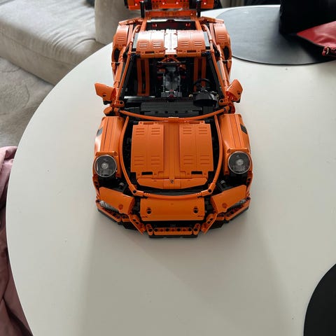 LEGO Technic Porsche 911 GT3 RS byggesæt i orange farve. Modellen er detaljeret og inkluderer funktionelle dele, der efterligner bilens design og mekanik. Egnet til samlere og byggeentusiaster, der ønsker at skabe en realistisk miniaturebil.