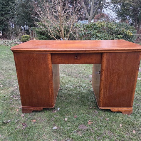 Antikt arbejdsbord i massivt eg. Holdbart, rustikt. Afsyrret men oprindeligt sortmalet. Har tilhørt den tidligere chefredaktør for Horsens Folkeblad (omkring 1950'erne angiveligt).