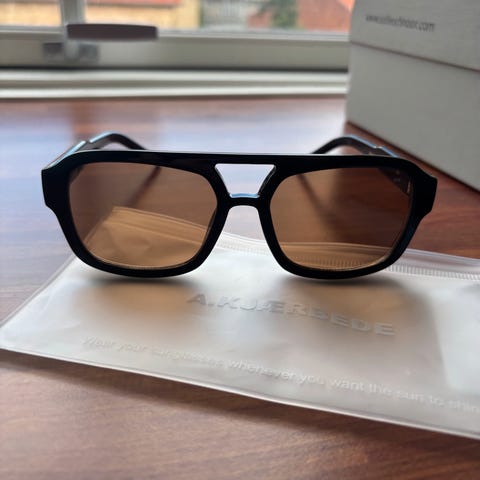 Flotte sorte solbriller fra A. Kjærbede. Dansk design. Mrk. Kaya. De er helt intakte, da stort set ikke brugt. De ligger i fint sort etui, som medfølger. Fra ikke ryger hjem.