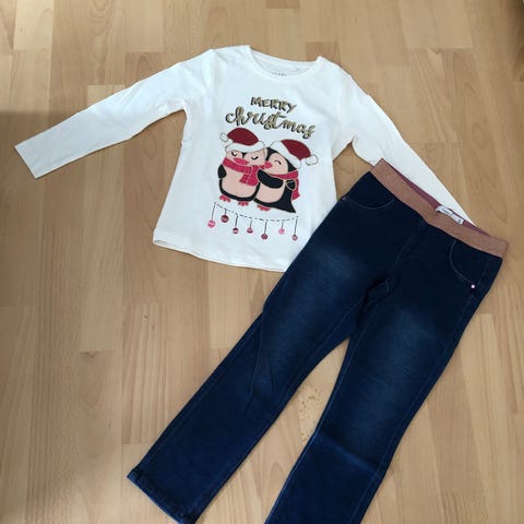Helt nyt flot pigesæt med julebluse sælges . Det er aldrig brugt - aldrig vasket. Det er fra Name it . Det er i str 110. Sættet består af bluse og cowboy leggings med flot glimmer elastik i taljen . Min datter er vokset fra det . Det sælges samlet for 150kr