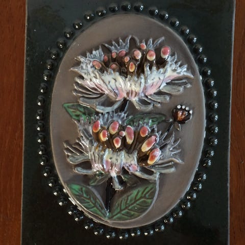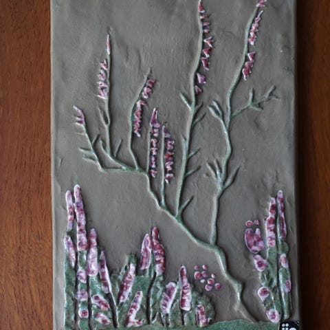 Fin keramisk relief / vægplade fra Jie Gantofta Sweden. Motivet er lyng (Calluna vulgaris Hull) på brun uglaseret baggrund med grøn kant. Glaseret.