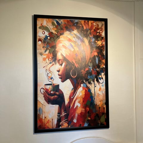 Dette maleri forestiller en kvinde med rød og sort ansigtsmaling. Maleriet er på lærred og har en træramme bagpå. Det viser detaljerede ansigtstræk og brug af stærke farver.
